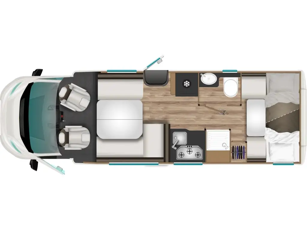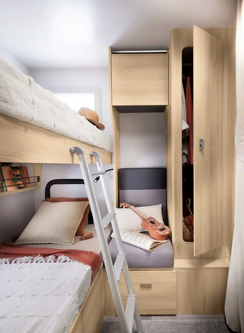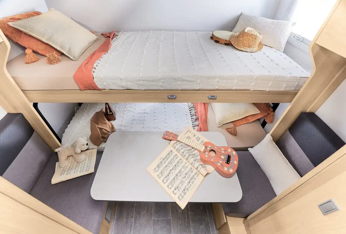 Das Reisemobil bietet einen familienfreundlichen und durchdachten Grundriss mit großzügigem Wohnbereich und viel Stauraum. Im Heck befinden sich zwei Etagenbetten (81 x 212 cm), ideal für Kinder oder zusätzliche Mitreisende. Die Sitzgruppe lässt sich zu einem zusätzlichen Bett (177 / 110 x 200 cm) umbauen und erweitert die Schlafkapazität bequem.