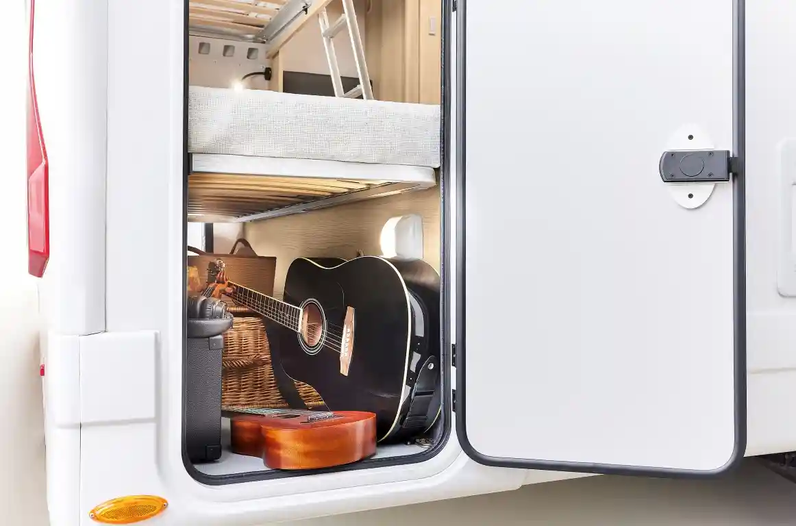 Die Ausstattung umfasst einen großen 145-Liter-Kühlschrank, eine moderne Design-Arbeitsfläche sowie eine Kochstelle mit 2 Flammen – optional auch mit 3 Flammen erhältlich. Ein großer Kleiderschrank, ein Querbad sowie die XL-Wohnraumtür sorgen für noch mehr Komfort im Alltag und auf Reisen.