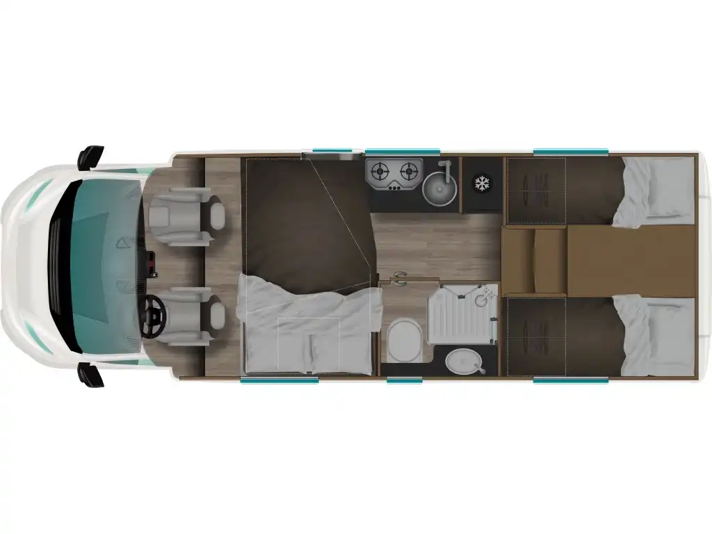 - 3-Punkt-Sicherheitsgurte mit Aufrollvorrichtung (Fahrerhaus und Wohnraum)