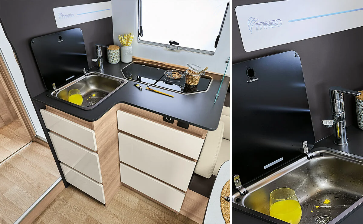 • Nirostastahl-Kochstelle mit 2 Flammen, separaten schwarzen Deckeln und Piezo-Zündung